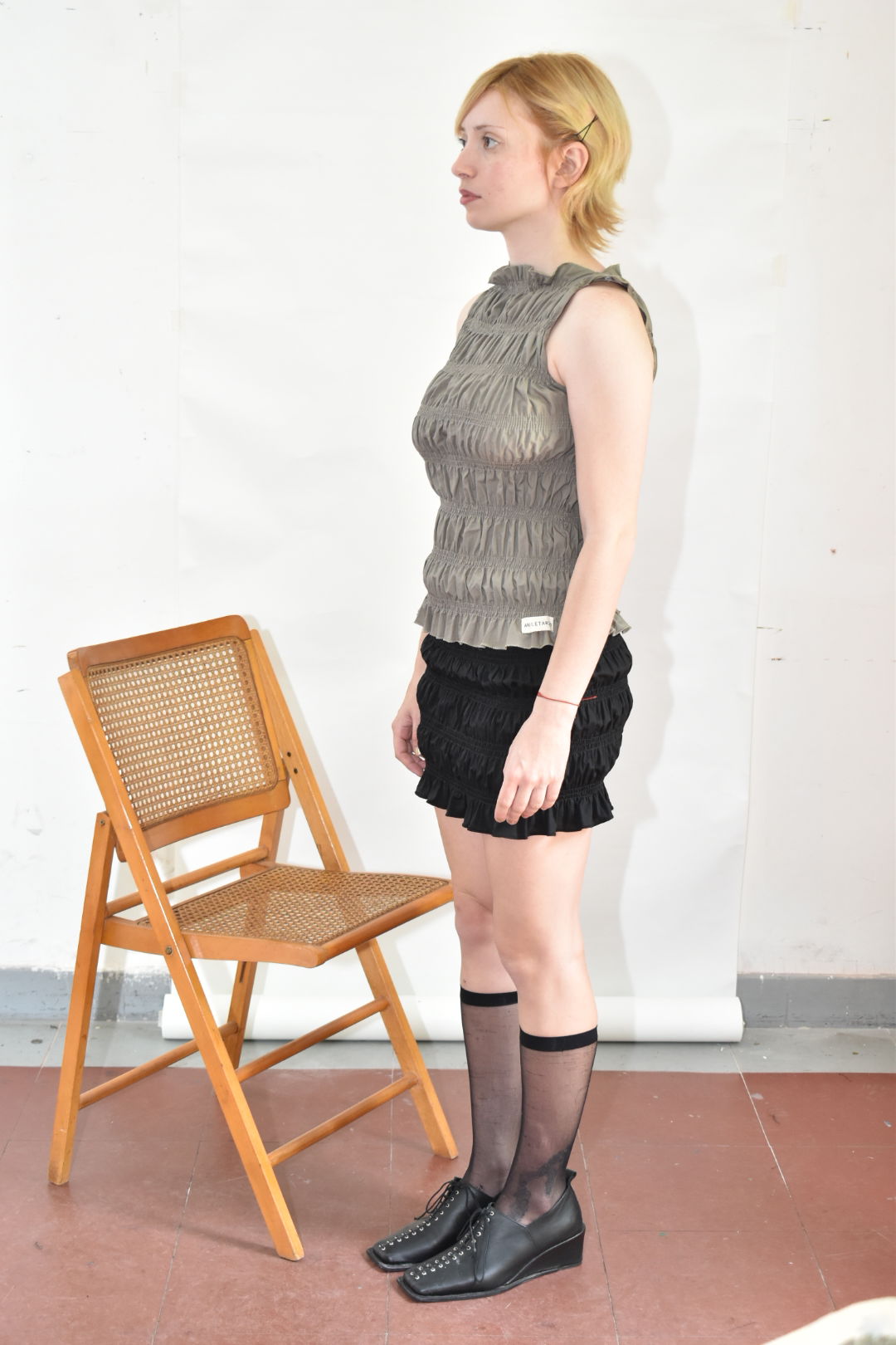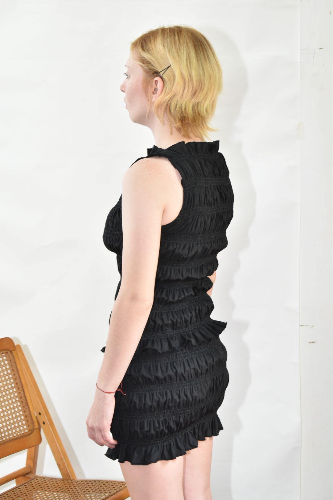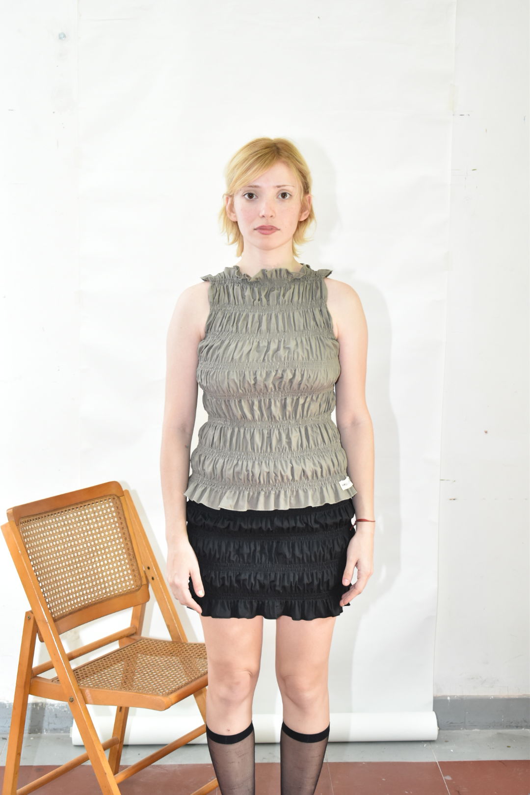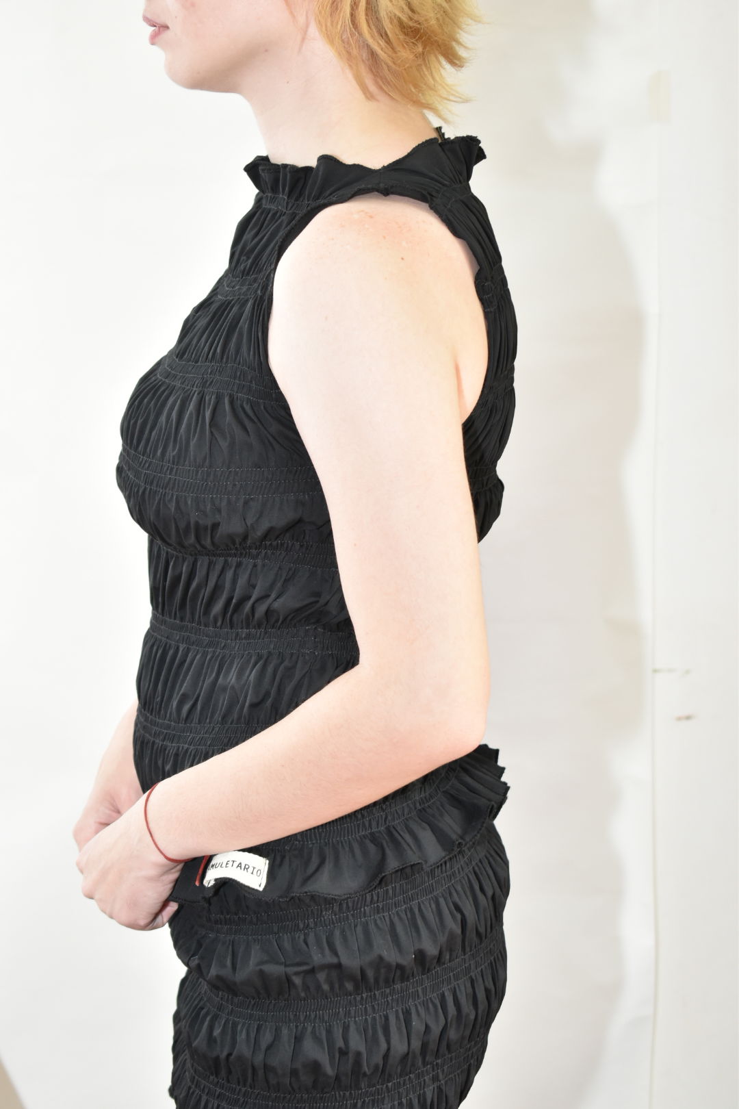 Top sin mangas de tela poplin de algodón fruncido. La prenda posee gran elasticidad y adaptabilidad.
