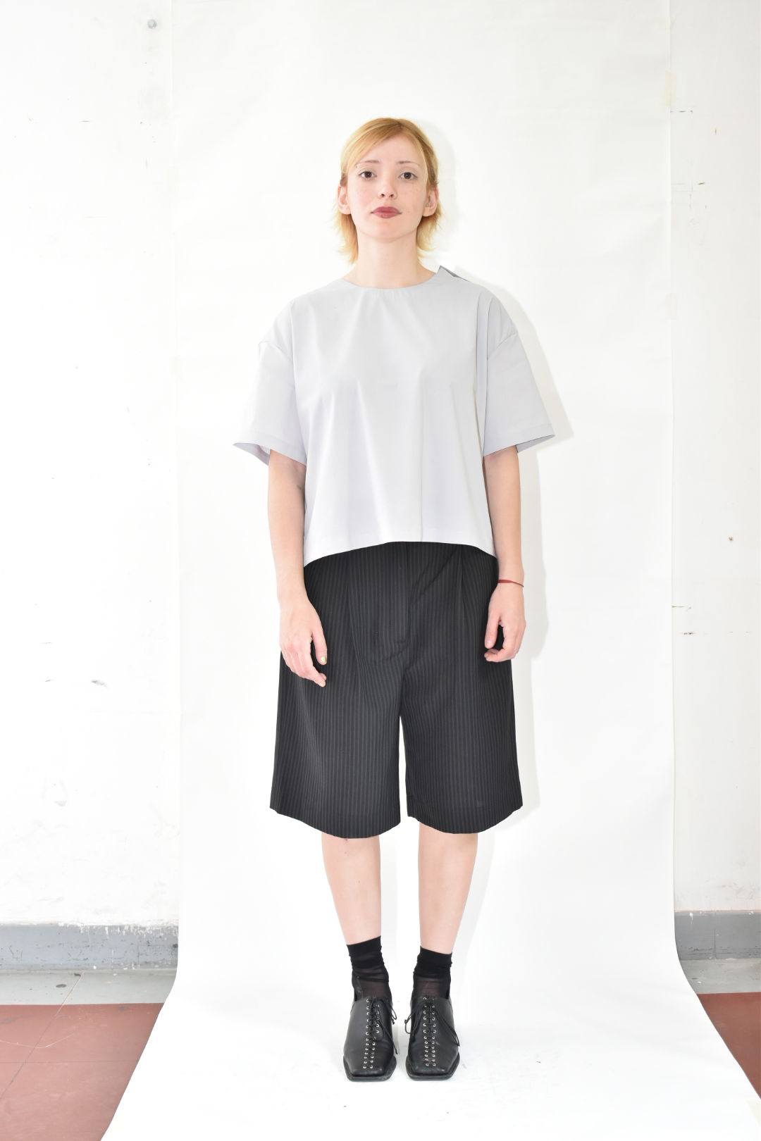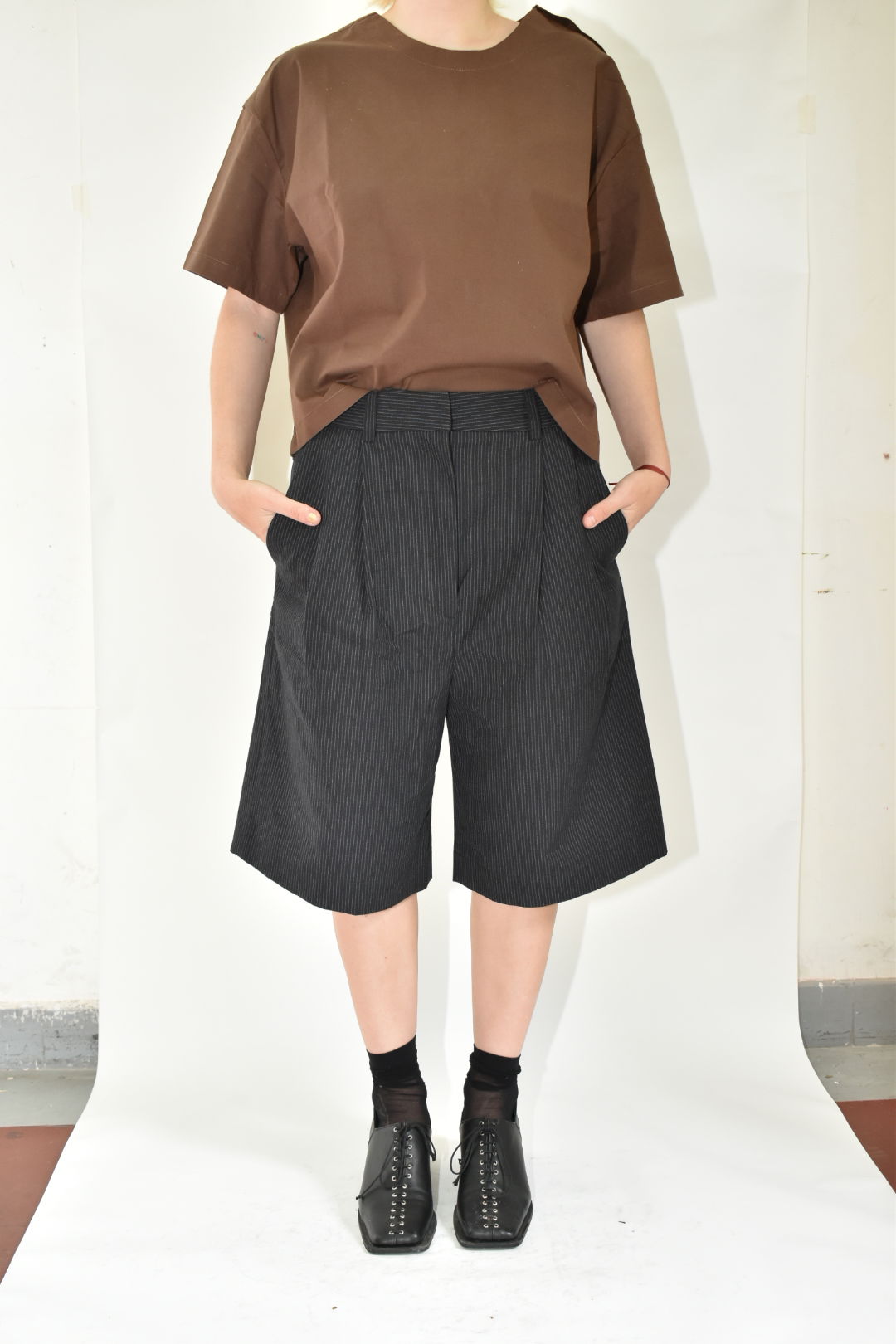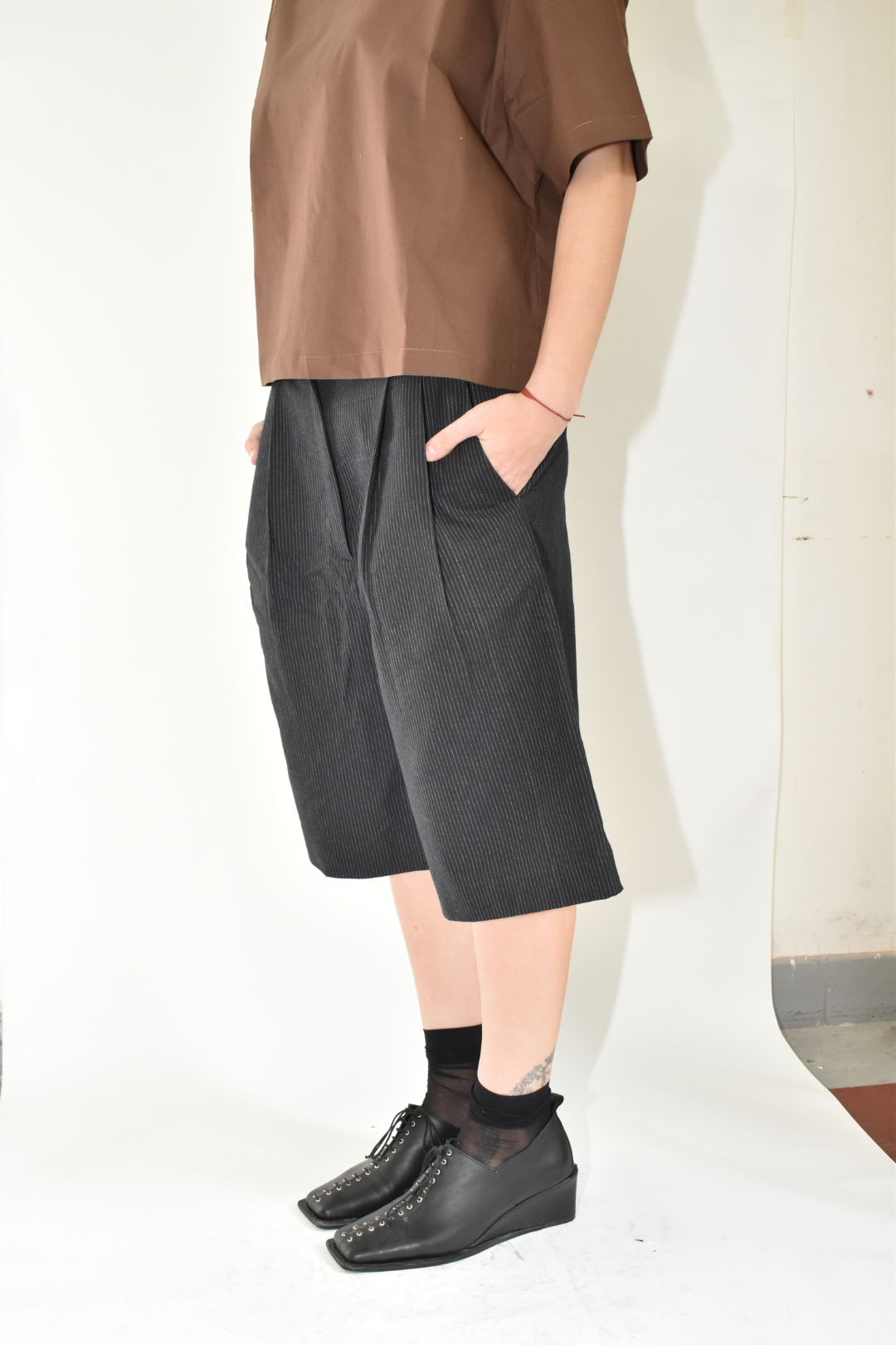 Bermuda sastrera. Con cintura media y silueta amplia. Bolsillos laterales y bolsillo ojal trasero. Prenda unisex.