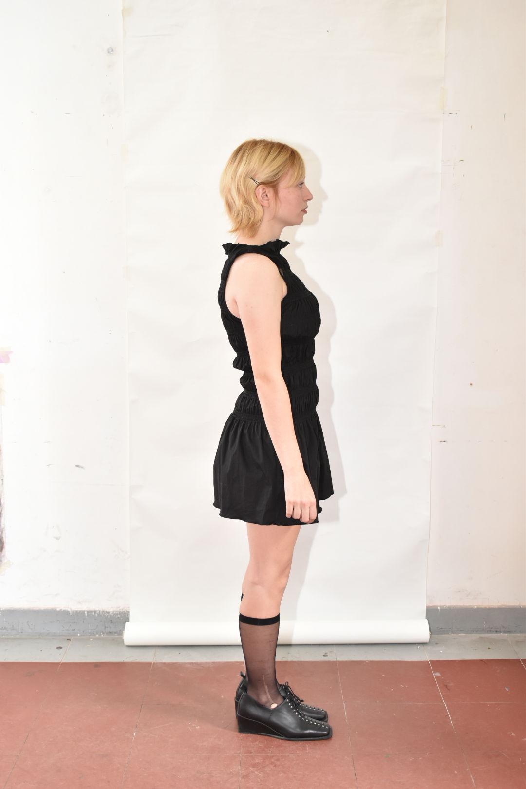 Vestido sin mangas de tela poplin de algodón fruncido. La prenda posee gran elasticidad y adaptabilidad.