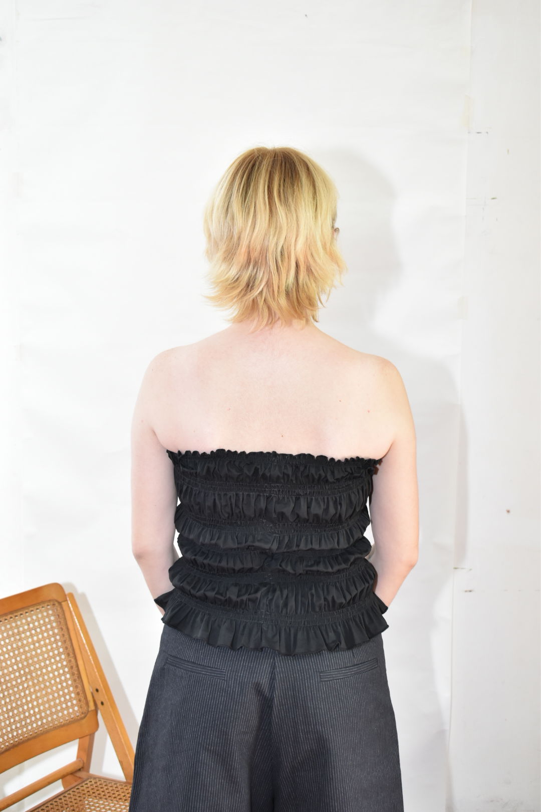 Top strapless de tela poplin de algodón fruncido con elástico en borde superior. La prenda posee gran elasticidad y adaptabilidad. También puede usarse como falda.